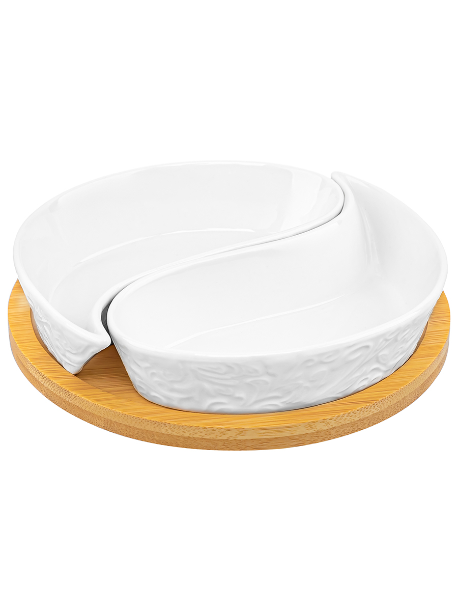 Тарелка под оливки «Инь-Янь» из серии «Лоза» на деревянной подставке от Elan Gallery подойдёт для сервировки закусок. Общий размер изделия – 15х15х3,5 см. Размер каждой ёмкости – 14х7х2,5 см, объём – 100 мл. Выполнена из высококачественного белого фарфора. Он не впитывает цвет продуктов и легко отмывается, благодаря чему надолго сохранит свою белизну. Поверхность изделия украшает рельеф в виде тонкой, элегантной лиственной лозы. Подставка выполнена из натурального бамбука. С маленькой менажницей вы сможете красиво подать маслины, орехи или сыры. Она послужит и в качестве небольшой конфетницы, поможет угостить себя и гостей любимыми сладостями за праздничным столом. Не рекомендуется применять абразивные моющие средства. Без бамбуковой подставки подходит для использования в посудомоечной машине и микроволновой печи. Бамбук нельзя замачивать! Поставляется в дизайнерской картонной коробке – благодаря ей вам не потребуется дополнительная подарочная упаковка. Фарфоровая сервировочная посуда послужит оригинальным подарком для хозяйки, ценящей не только практичность, но и привлекательность. Серия «Лоза» от бренда Элан Галерея станет украшением любого кухонного инвентаря и позволит собрать сервиз в едином стиле!