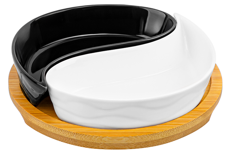 Тарелка под оливки «Инь-Янь» из серии «Айсберг волны» на деревянной подставке от Elan Gallery подойдёт для сервировки закусок. Общий размер изделия – 15х15х3,5 см. Размер каждой ёмкости – 14х7х2,5 см, объём – 100 мл. Выполнена из высококачественного белого фарфора. Он не впитывает цвет продуктов и легко отмывается, благодаря чему надолго сохранит свою белизну. Поверхность изделия украшают рельефные узоры в виде поперечных волн. Подставка выполнена из натурального бамбука. С маленькой менажницей вы сможете красиво подать маслины, орехи или сыры. Она послужит и в качестве небольшой конфетницы, поможет угостить себя и гостей любимыми сладостями за праздничным столом. Не рекомендуется применять абразивные моющие средства. Без бамбуковой подставки подходит для использования в посудомоечной машине и микроволновой печи. Бамбук нельзя замачивать! Поставляется в дизайнерской картонной коробке – благодаря ей вам не потребуется дополнительная подарочная упаковка. Фарфоровая сервировочная посуда послужит оригинальным подарком для хозяйки, ценящей не только практичность, но и привлекательность. Серия «Айсберг волны» от бренда Элан Галерея станет украшением любого кухонного инвентаря и позволит собрать сервиз в едином стиле!
