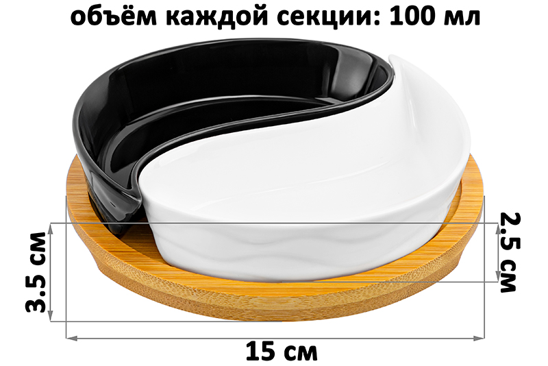 Тарелка под оливки «Инь-Янь» из серии «Айсберг волны» на деревянной подставке от Elan Gallery подойдёт для сервировки закусок. Общий размер изделия – 15х15х3,5 см. Размер каждой ёмкости – 14х7х2,5 см, объём – 100 мл. Выполнена из высококачественного белого фарфора. Он не впитывает цвет продуктов и легко отмывается, благодаря чему надолго сохранит свою белизну. Поверхность изделия украшают рельефные узоры в виде поперечных волн. Подставка выполнена из натурального бамбука. С маленькой менажницей вы сможете красиво подать маслины, орехи или сыры. Она послужит и в качестве небольшой конфетницы, поможет угостить себя и гостей любимыми сладостями за праздничным столом. Не рекомендуется применять абразивные моющие средства. Без бамбуковой подставки подходит для использования в посудомоечной машине и микроволновой печи. Бамбук нельзя замачивать! Поставляется в дизайнерской картонной коробке – благодаря ей вам не потребуется дополнительная подарочная упаковка. Фарфоровая сервировочная посуда послужит оригинальным подарком для хозяйки, ценящей не только практичность, но и привлекательность. Серия «Айсберг волны» от бренда Элан Галерея станет украшением любого кухонного инвентаря и позволит собрать сервиз в едином стиле!