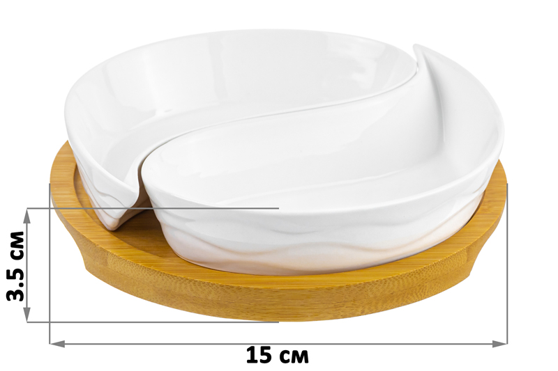 Тарелка "Инь-Янь" из серии "Айсберг волны" 15х15х3,5 см на деревянной подставке подойдет для красивой подачи оливок, орешков, закусок, сладостей и самых разных продуктов. Тарелка-менажница украшена рельефными орнаментами. Состоит из 2-х секций, которые можно использовать по отдельности. Объем каждой секции 100 мл. Набор выполнен из высококачественного фарфора и натурального бамбука. Бамбуковую подставку нельзя использовать в микроволновой печи и посудомоечной машине. Набор поставляется в яркой картонной упаковке. Тарелка "Инь-Янь" из серии посуды "Айсберг волны" сможет стать настоящим украшением кухни или приятным подарком для ваших родных и близких!