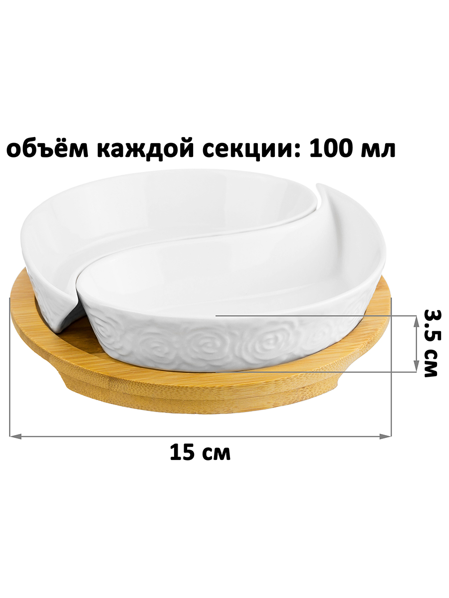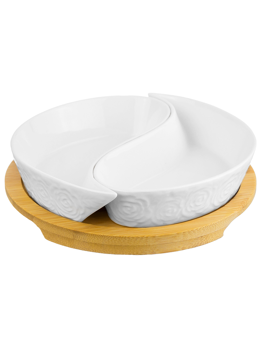 Тарелка под оливки «Инь-Янь» из серии «Розы» на деревянной подставке от Elan Gallery подойдёт для эстетичной сервировки вашего стола. Общий размер изделия – 15х15х3,5 см, размер каждой секции – 14х7х2,5 см, объём – 100 мл. Выполнена из высококачественного белого фарфора. Он не впитывает цвет продуктов и легко отмывается, благодаря чему надолго сохраняет свою белизну. Поверхность изделия украшают рельефные узоры в виде пышных бутонов роз. Подставка выполнена из натурального бамбука. Размер подставки – 15х15х1 см, внутренний диаметр – 13,5 см. Менажница поможет красиво подавать маслины, орехи или сыры. Она станет незаменимым элементом праздничных обедов или неторопливых завтраков. Послужит в качестве конфетницы, позволив угостить себя и гостей любимыми сладостями: конфетами, мармеладом, леденцами или безе. Не рекомендуется применять абразивные моющие средства. Без бамбуковой подставки подходит для использования в посудомоечной машине и микроволновой печи. Бамбук нельзя замачивать! Поставляются в дизайнерской картонной коробке – благодаря ей вам не потребуется дополнительная подарочная упаковка. Фарфоровая сервировочная посуда будет оригинальным подарком для хозяйки, ценящей не только практичность, но и привлекательность. Серия «Розы» от бренда Элан Галерея станет украшением любого кухонного инвентаря и позволит собрать красивый сервиз в едином стиле!