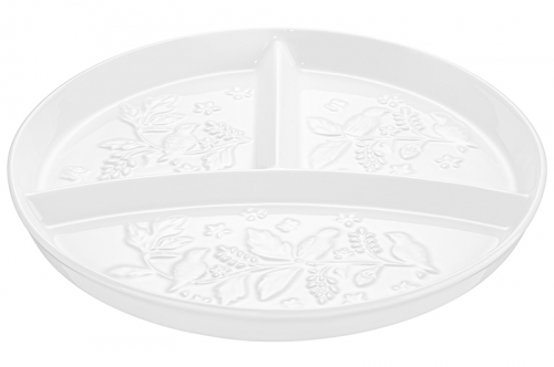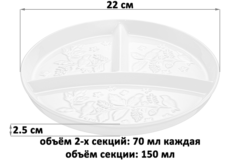 Секционная тарелка с бортиками для правильного питания от бренда Elan Gallery "Птички на ветке" размером 22х22х2,5 см имеет 3 секции и выполнена из белого фарфора. Представляет собой цельное блюдо с тремя отсеками: 1 объёмом 150 мл, 2 по 70 мл каждый. Посуда серии украшена рельефным узором в виде фигурок птичек на изящных веточках. Тарелка круглой формы с разделителями удобна для тех, кто ведёт здоровый образ жизни и придерживается диетического питания (ПП). Можно использовать как умную тарелку для похудения: разложите в отдельные секторы фрукты и овощи, белки и углеводы – чтобы спланировать свой рацион и контролировать порции. Такое приспособление позволит придерживаться диеты и не превышать допустимый уровень потребления калорий. Менажница подходит для стандартной сервировки и подачи различных закусок: сырной и мясной нарезки, канапе или роллов. Сервировочное блюдо пригодится, чтобы создать идеальную атмосферу для приема гостей или романтического ужина дома. Благодаря отдельным секциям вы можете использовать одну и ту же порционную тарелочку для солений, оливок, сыра и колбасы. Такой подход к сервировке позволит сэкономить место на вашем столе. Возьмите на пикник, эргономичная форма позволит разместить все необходимые закуски и сладости. Избегать резких перепадов температур и беречь от механических повреждений. Не рекомендуется применять абразивные моющие средства. Можно использовать в микроволновой печи и мыть в посудомоечной машине. Поставляется в красочной картонной упаковке. Эта менажница станет полезным подарком для хозяйки, которая ценит функциональные товары для дома и стильную сервировку, а также тех, кто увлекается фитнесом и хочет похудеть. Понравится любителям посуды в скандинавском стиле. Серия "Птички на ветке" позволит собрать сервиз в едином стиле и сможет стать настоящим украшением вашего дома.