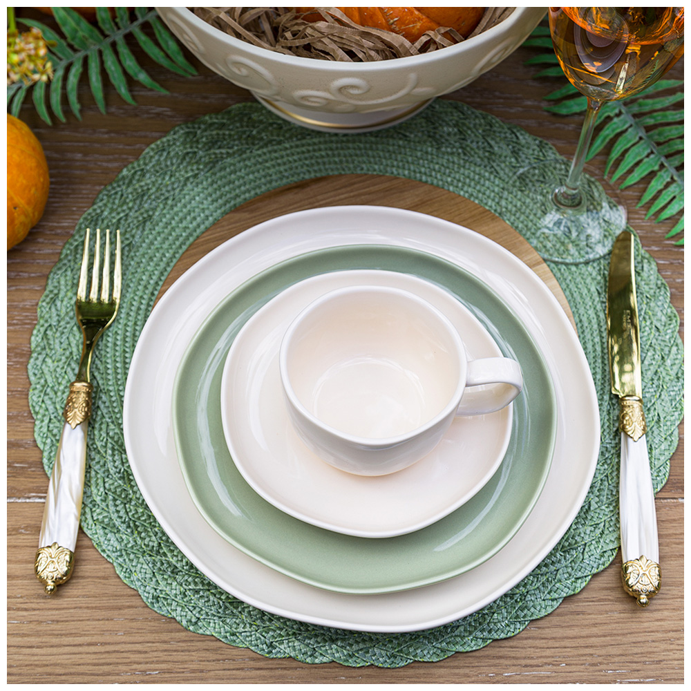 Ультрамодная коллекция TRENDY ТМ LEFARD предлагает свежую цветовую гамму, неординарные «мятые» формы и отличное качество упрочненного фарфора. В коллекции два теплых натуральных цвета – темного зеленого чая или спаржи и кремового или топленого молока, которые прекрасно комбинируются между собой и коллекцией VILLAGE.