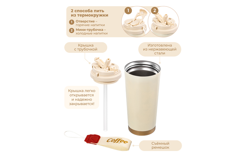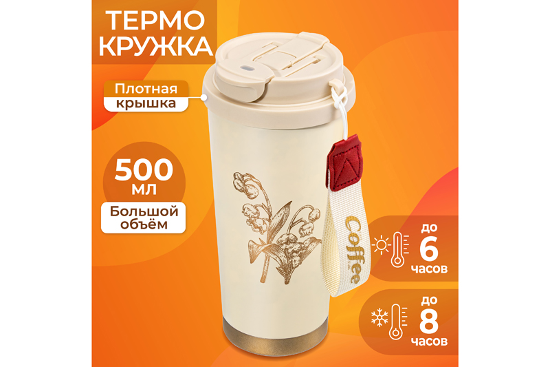 Термокружка объёмом 500 мл со съёмным ремешком – это стильное и функциональное решение для любителей горячих и холодных напитков. Изделие тёплого бежевого цвета украшено золотистым изображением ландышей и имеет привлекательный дизайн. Нижняя часть стакана украшена золотистой каймой. Размер 9х9х19,5 см. Изготовлена из нержавеющей стали, благодаря чему держит тепло до 6 часов и сохраняет холод до 8 часов. С обратной стороны дна имеет круглую антискользящую накладку из полиуретана, поэтому устойчива даже на очень гладкой поверхности. Кружка обладает закручивающейся пластиковой крышкой с 2 клапанами. Благодаря такой системе из неё можно пить двумя способами: под одним клапаном спрятано стандартное отверстие, под вторым – трубочка. Клапан над стандартным отверстием имеет силиконовый уплотнитель, который обеспечивает герметичность при закрытии. Клапан с трубочкой плотно закрывается – до щелчка. Теперь вы можете наслаждаться крепким чаем или ароматным кофе, даже если находитесь не дома. Термопосуду можно использовать для горячих напитков, питьевой воды и любой другой жидкости. Эргономичный дизайн делает походную термокружку идеальным спутником для путешествий, работы или активного образа жизни. Можно брать с собой в автомобиль, дать ребёнку в школу. Не рекомендуется применять абразивные моющие средства. Можно мыть в посудомоечной машине. Не использовать в микроволновой печи! Поставляется в красочной картонной коробке. Станет полезным подарком на любой праздник. Подарите красивую посуду своим близким, благодаря стильной коробочке не понадобится подарочная упаковка. С термокружкой вы сможете наслаждаться любимыми напитками в течение дня и добавить комфорта в свою повседневную жизнь!