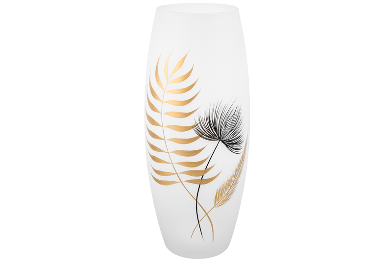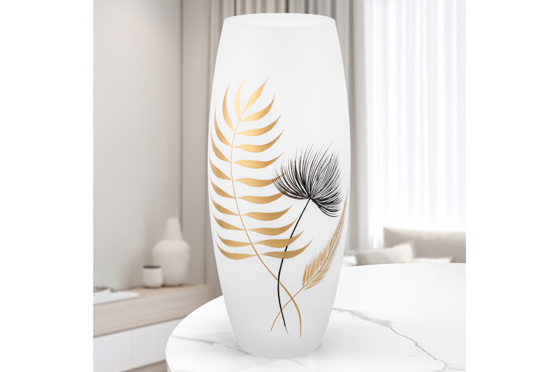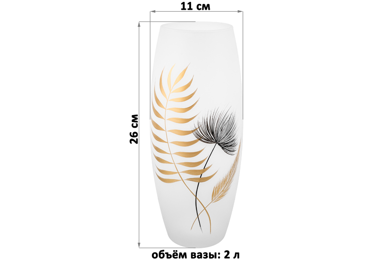 Ваза Elan Gallery "Веточки" размером 11х11х26 см и объёмом 2 литра выполнена из прочного матового стекла белого цвета, имеет оригинальный дизайн. Вазочка в форме бочонка с изображением золотых и чёрных растений подойдет для размещения букетов, искусственных цветов или сухоцветов. Эргономичная форма подходит для цветов с длинными стеблями. Стеклянная ваза послужит стильным элементом декора для вашего дома. Поставьте в нее цветы и вазочка изящно подчеркнет красоту букета. Интерьерная ваза украсит комнату даже без наполнения. Разместите её на столе или полке, чтобы создать в комнате стильный акцент. Не рекомендуется применять абразивные моющие средства. Декоративная ваза поставляется в прочной картонной упаковке. Станет шикарным подарком вашим близким: маме, бабушке, сестре или подруге на любой праздник. Красивая ваза с рисунком в золотистых и чёрных тонах станет украшением вашего дома и подчеркнёт красоту любого цветка!