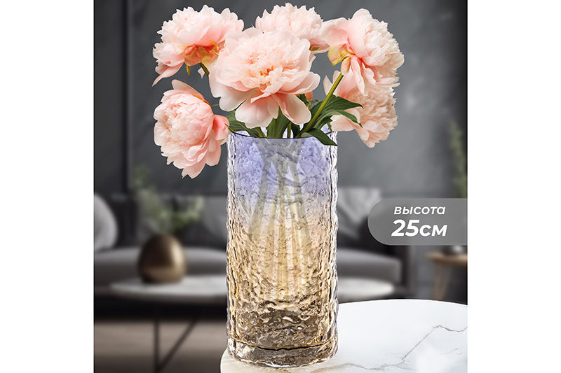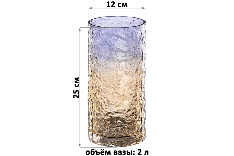 Ваза ручной выдувки от Elan Gallery с сине-бежевым градиентом выполнена из стекла. Объём 2 литра, размер 12х12х25 см. Высокая ваза цилиндрической формы имеет рельефную поверхность с эффектом мятого стекла. Подойдёт для живых и искусственных цветов, веток и сухоцветов. Стильная вазочка послужит элементом декора для вашего дома. В ней красиво будут смотреться букеты из любых цветов или веточек: роз, тюльпанов, вербы. Интерьерная ваза в форме цилиндра с необычным рельефом украсит комнату даже без наполнения. Подойдёт для оформления декоративных композиций. Эргономичная форма позволит поставить в неё цветы с длинными стеблями. Разместите вазу на столе или полке, чтобы украсить спальню роскошным букетом пионов или другими растениями! На Новый год и Рождество поставьте в стеклянную вазочку еловые ветки с ёлочными игрушками для создания праздничной атмосферы. Не рекомендуется применять абразивные моющие средства. Поставляется в картонной коробке. Сделайте сюрприз своим близким или коллегам на любой праздник! Предметы декора – хороший подарок как мужчине, так и женщине. Красивый дизайн и функциональность понравятся каждому! Вазочка станет украшением домашнего интерьера и подчеркнёт красоту любого цветка. В коллекции бренда Elan Gallery можно найти много стильных товаров для дома. Здесь есть всё для создания уюта в квартире и на даче!