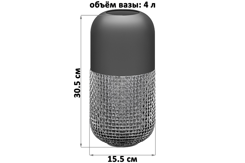 Ваза ручной выдувки от Elan Gallery объёмом 4 литра выполнена из стекла. Размер 15,5х15,5х30,5 см, внутренний диаметр горлышка 8 см. Вазочка тёмно-серого цвета имеет матовую верхнюю часть. Низ изделия выполнен из полупрозрачного стекла и украшен рельефным узором в виде квадратов. Стильная вазочка с ребристыми элементами послужит предметом декора для вашего дома! Подойдёт для живых и искусственных цветов, веток и сухоцветов. В ней красиво будут смотреться букеты из любых цветов или веточек: роз, тюльпанов, вербы. Интерьерная ваза с рельефом украсит комнату даже без наполнения. Подойдёт для оформления декоративных композиций. Эргономичная форма позволит поставить в неё цветы с длинными стеблями. Разместите декоративную вазу на столе или полке, чтобы украсить спальню роскошным букетом гладиолусов или другими растениями! На Новый год и Рождество поставьте в стеклянную вазочку еловые ветки с ёлочными игрушками для создания праздничной атмосферы. Не рекомендуется применять абразивные моющие средства. Поставляется в картонной коробке. Сделайте сюрприз своим близким или коллегам на любой праздник! Предметы декора – хороший подарок как мужчине, так и женщине. Красивый дизайн и функциональность понравятся каждому! Большая ваза станет украшением домашнего интерьера и подчеркнёт красоту любого цветка. В коллекции бренда Elan Gallery можно найти много стильных товаров для дома. Здесь есть всё для создания уюта в квартире и на даче!