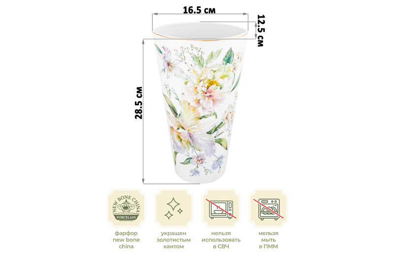 Настольная ваза Elan Gallery "Корнелия" размером 16,5х12,5х28,5 см и объёмом 2,4 литра выполнена из фарфора нового поколения new bone china. От костяного фарфора new bone china отличается большей экологичностью в производстве. Поверхность изделия овивают обворожительные белые пионы. Они выполнены в манере, вдохновлённой акварельным рисунком. Тонкая золотистая окантовка служит деликатным акцентом и подчёркивает их изысканность. Интерьерная вазочка подойдёт для размещения букетов, искусственных цветов или сухоцветов. Она послужит элементом декора вашего дома и поможет украсить его любыми растениями. Как красиво будут смотреться букеты из живых цветов и веточек на кухне и в любой комнате! Поставьте на видное место розы, тюльпаны или вербу для оформления интерьера в квартире. Интерьерная ваза украсит комнату даже без наполнения и подойдёт для создания декоративных композиций на журнальном столике или полке. Эргономичная форма позволит поставить в неё цветы с длинными стеблями. Не рекомендуется применять абразивные моющие средства. Поставляется в красочной коробке. Станет приятным подарком вашим близким на любой праздник. Благодаря стильной коробочке вам не понадобится дополнительная подарочная упаковка. Красивая фарфоровая ваза с цветочным рисунком станет украшением вашего дома и подчеркнёт красоту любого цветка. В серии "Корнелия" от бренда Элан Галерея вы найдёте всё для элегантной сервировки и украшения домашнего интерьера!