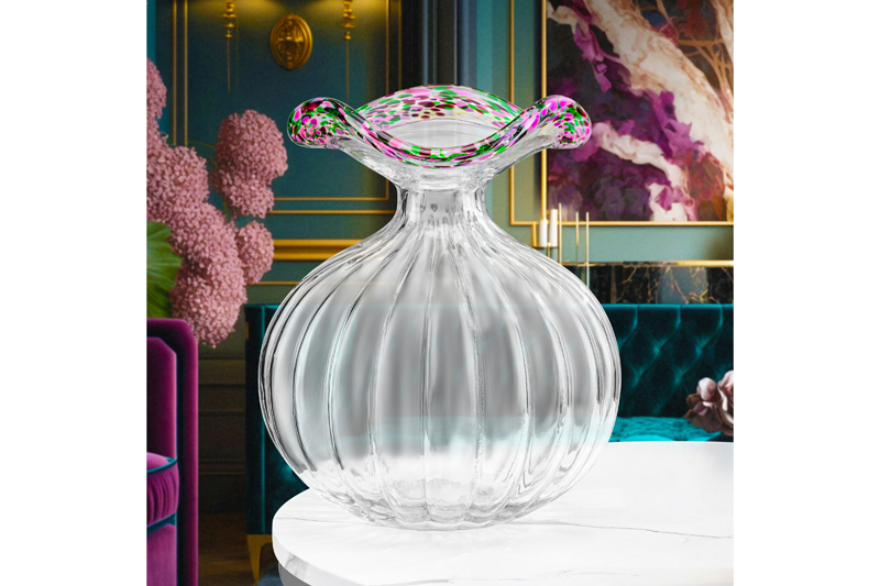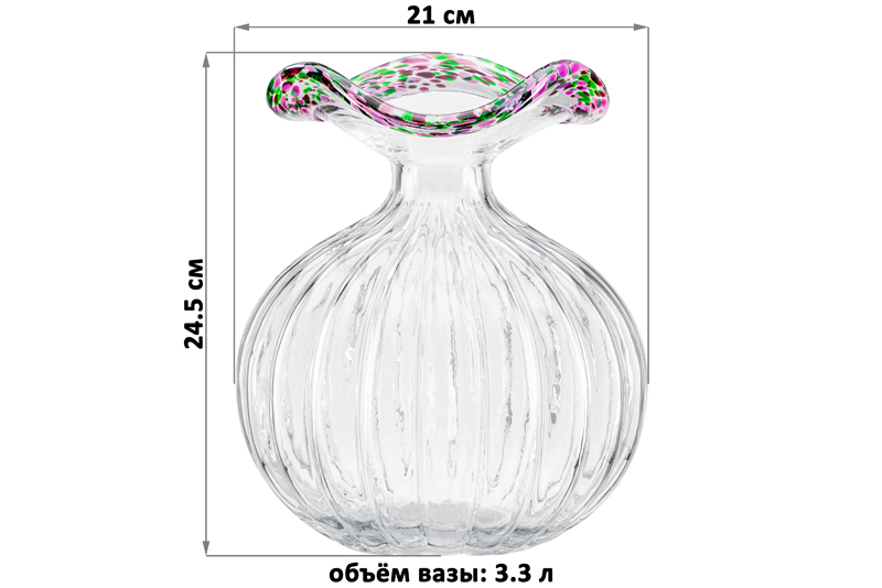 Ваза ручной выдувки размером 21х21х24,5 см и объемом 3,3 л. выполнена из прочного стекла, имеет разноцветный ободок. Высокая ваза подойдет для размещения букетов, искусственных цветов, сухоцветов или декоративных веток. Эргономичная форма вазы подходит для цветов с длинными стеблями и изящно подчеркивает их красоту. Интерьерная ваза украсит комнату даже при использовании без наполнения. Разместите ее на столе или полке, чтобы задать в комнате стильный акцент. Поставляется в прочной картонной упаковке. Красивая ваза сможет стать настоящим украшением дома или приятным подарком для родных и близких.