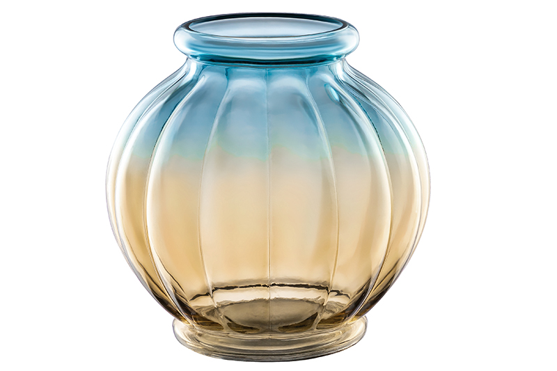 Круглая ваза ручной выдувки размером 21х21х21,5 см и объёмом 5 литров выполнена из прочного бежево-голубого стекла. Вазочка подойдёт для размещения живых и искусственных цветов, сухоцветов и веточек. Её широкое горлышко вместит даже пышный букет или цветочную композицию. Полупрозрачная ваза имеет бежево-голубой цвет и украшена крупным рельефом, напоминающим апельсиновые дольки. Она идеально дополнит интерьер вашей квартиры и украсит любую комнату. Утолщённое дно обеспечивает устойчивость вазы. Её можно разместить в гостиной, на кухне или в прихожей. Декоративная ваза поможет создать в доме праздничную атмосферу. Не рекомендуется применять абразивные моющие средства. Поставляется в прочной картонной коробке. Такая ваза станет идеальным подарком для любой женщины!