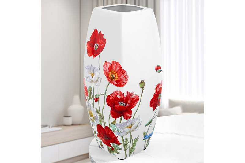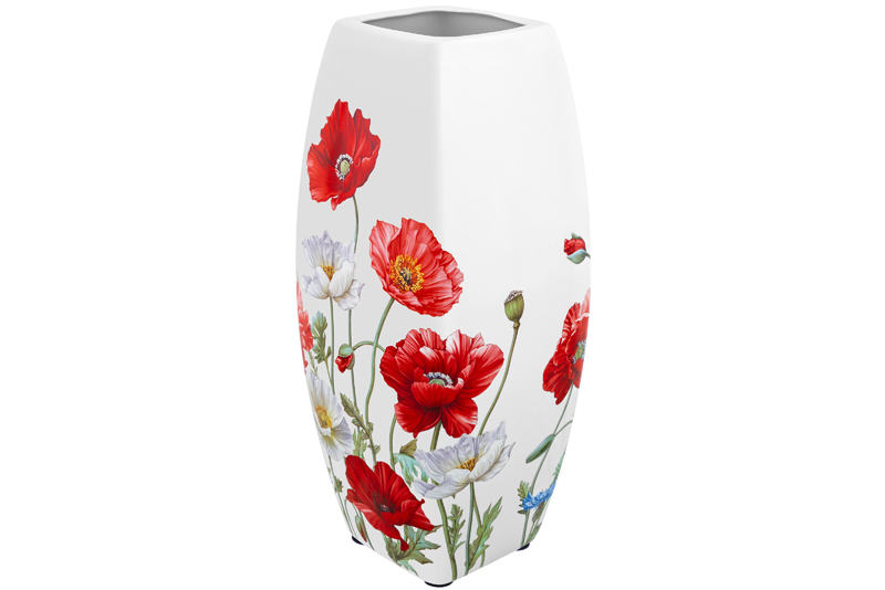 Настольная ваза Elan Gallery "Маки" размером 12,5х12,5х30 см и объёмом 3,15 литра прямоугольной формы выполнена из фарфора нового поколения new bone china. New bone china сочетает в себе изящность и высокую прочность. От других видов костяного фарфора материал отличается большей экологичностью в производстве. Серия "Маки" украшена красочным принтом с крупными цветами. Изображение красных и белых маков добавит ярких красок интерьеру. Имеет маленькие антискользящие накладки с обратной стороны дна для устойчивости на гладкой поверхности. Интерьерная вазочка подойдёт для размещения букетов, искусственных цветов или сухоцветов. Она послужит элементом декора вашего дома и поможет украсить его любыми растениями. Как красиво будут смотреться букеты из живых цветов и веточек на кухне и в любой комнате! Поставьте на видное место розы, тюльпаны или вербу для оформления интерьера в квартире. Ваза украсит комнату даже без наполнения и подойдёт для создания декоративных композиций на журнальном столике или полке. Эргономичная форма позволит поставить в неё цветы с длинными стеблями. Не рекомендуется применять абразивные моющие средства. Поставляется в красочной коробке. Станет приятным подарком на любой праздник. Благодаря стильной коробочке вам не понадобится дополнительная подарочная упаковка. Красивая фарфоровая ваза с рисунком станет украшением вашего дома и подчеркнёт красоту любого цветка. Ознакомьтесь с другими товарами для дома от Elan Gallery, здесь вы найдёте всё для создания уюта!