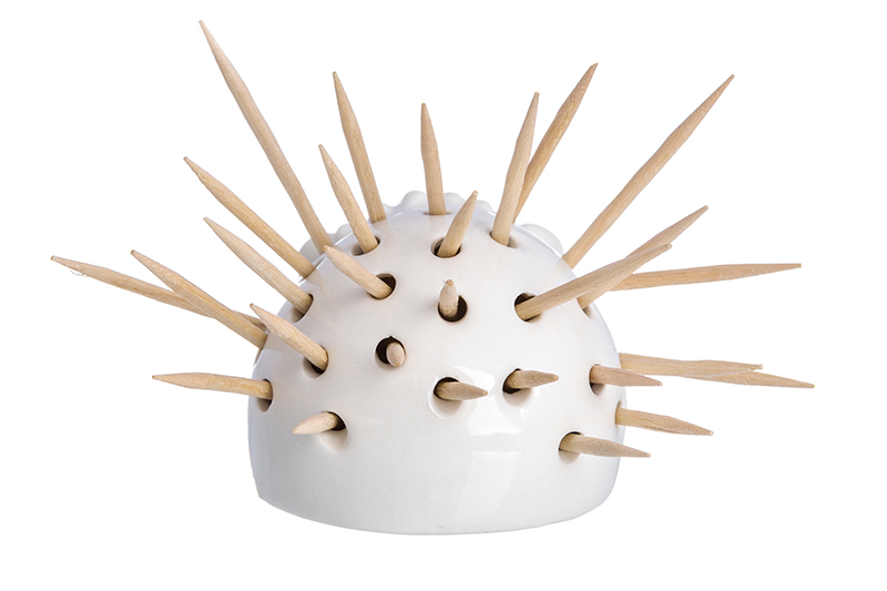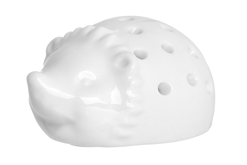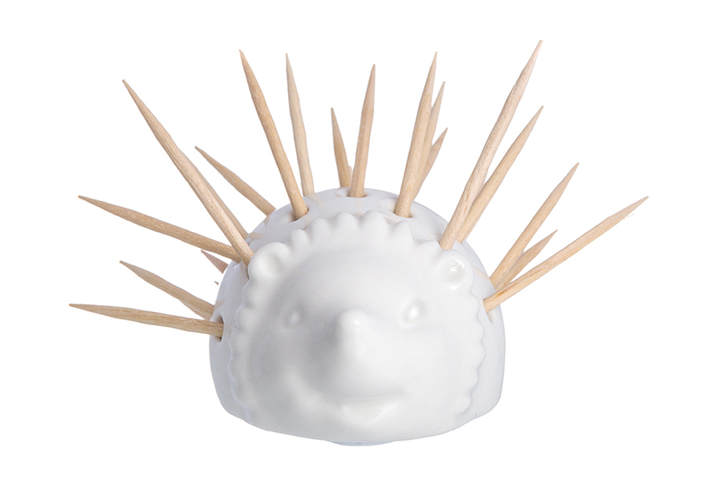 Вазочка под зубочистки в форме ежика идет в комплекте с пачкой зубочисток. Вазочка выполнена из белой керамики с отверстиями на спинке ежика для установки зубочисток. Зубочистки удобно доставать и пополнять запас.