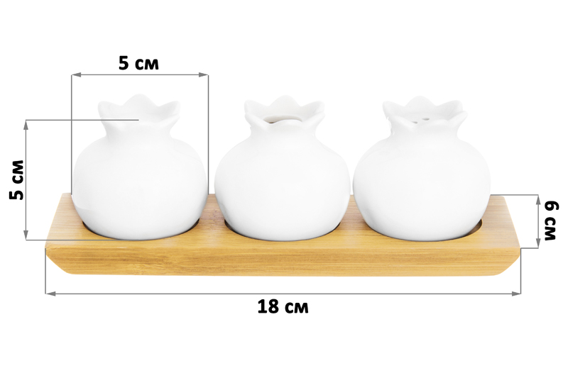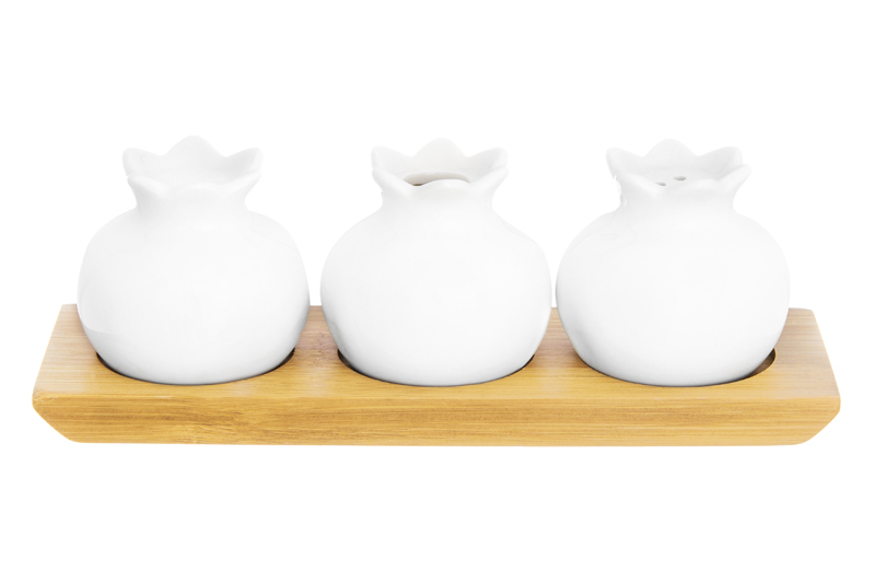 Набор для специй и вазочка для зубочисток в виде гранатов на деревянной подставке прекрасный пример высококачественной, удобной и лаконичной посуды для изящной сервировки стола. Гранаты выполнены из прочного белого фарфора, а подставка из бамбука. Наполнить перечницу и солонку можно через отверстие в донышке, которое надежно закрывается пластиковой пробкой. В серии фарфоровой посуды с использованием бамбука представлен широкий ассортимент товаров для сервировки стола, которые, несомненно, впишутся в любой интерьер благодаря лаконичному дизайну, натуральным материалам и высокой функциональности. Такому подарку будет рада любая хозяйка!