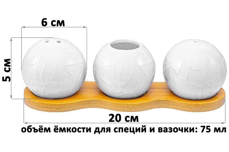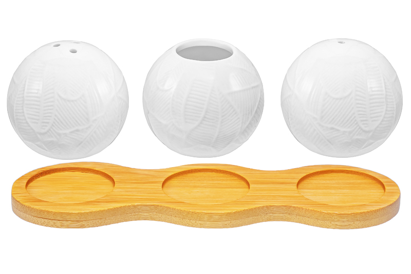 Сервировочный набор из серии «Танзания» от Elan Gallery предназначен для эстетичного оформления вашего стола. Включает в себя баночку для зубочисток (зубочистки в комплекте), солонку и перечницу. Общий размер изделия – 20х6,5х6 см, размер каждой ёмкости – 6х6х5 см, объём – 75 мл. Выполнены из высококачественного белого фарфора и украшены рельефом налегающих друг на друга тропических листьев с тонкими прожилками. Подставка выполнена из бамбука. Благодаря набору во время приготовления пищи, а также застолий, всё необходимое будет под рукой. Благодаря маленькой вазочке вы всегда сможете компактно хранить зубочистки. Ёмкости для специй и приправ можно заполнить сахаром и солью, чтобы каждый имел возможность приправить блюда по своему вкусу. Не рекомендуется применять абразивные моющие средства. Без бамбуковых элементов подходит для использования в микроволновой печи и посудомоечной машине. Бамбук нельзя замачивать! Поставляется в дизайнерской картонной коробке – благодаря ей вам не потребуется дополнительная подарочная упаковка. Это идеальный подарок для хозяйки, ценящей не только практичность, но и привлекательность. Серия «Танзания» от бренда Элан Галерея станет украшением любого кухонного инвентаря и позволит собрать сервиз в едином стиле!