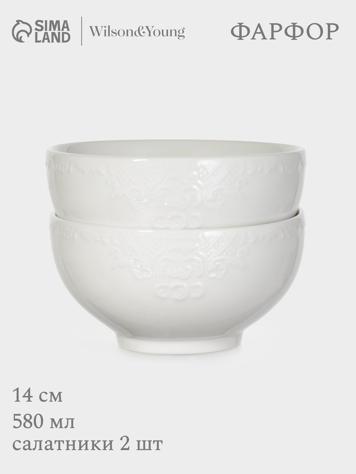 Представляем вам набор из двух белых фарфоровых салатников объемом 580 мл каждый. Салатники выполнены из нового костяного фарфора с рельефной текстурой и барельефом, придающим им особый шарм. Подходят для подачи салатов, закусок и других блюд. Можно использовать в микроволновой печи и мыть в посудомоечной машине.