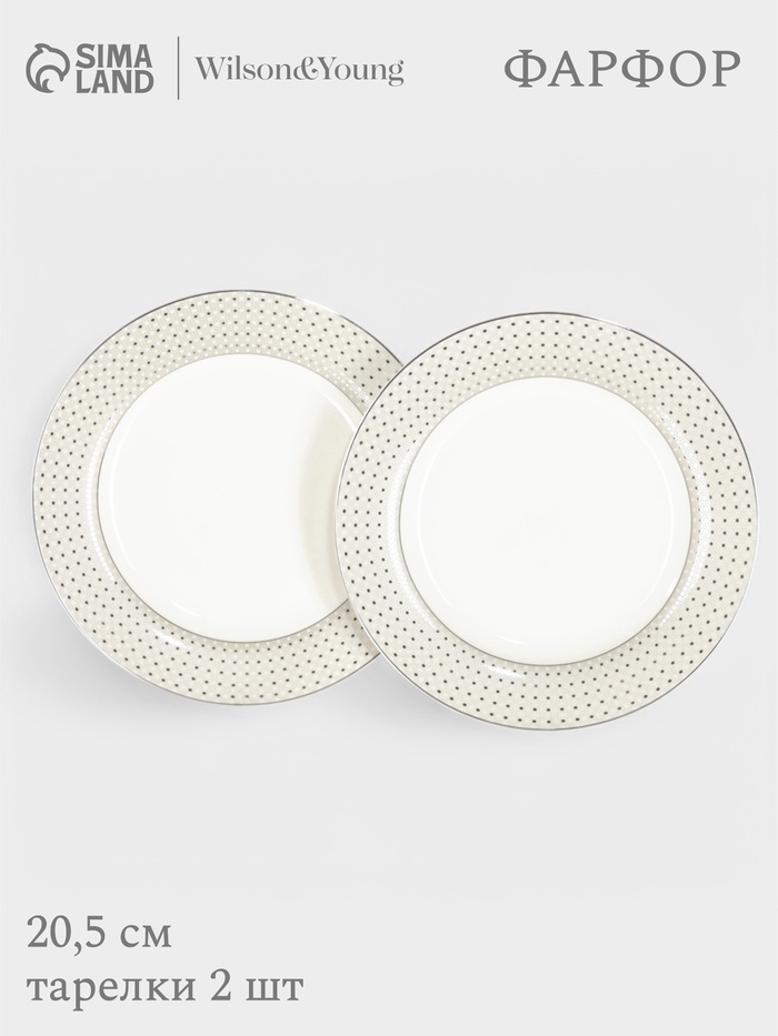 Набор из двух белых фарфоровых тарелок с изящной серебряной отводкой. Диаметр каждой тарелки 20.5 см. Подходит для подачи различных блюд. Обратите внимание: не предназначены для использования в микроволновой печи и посудомоечной машине.
