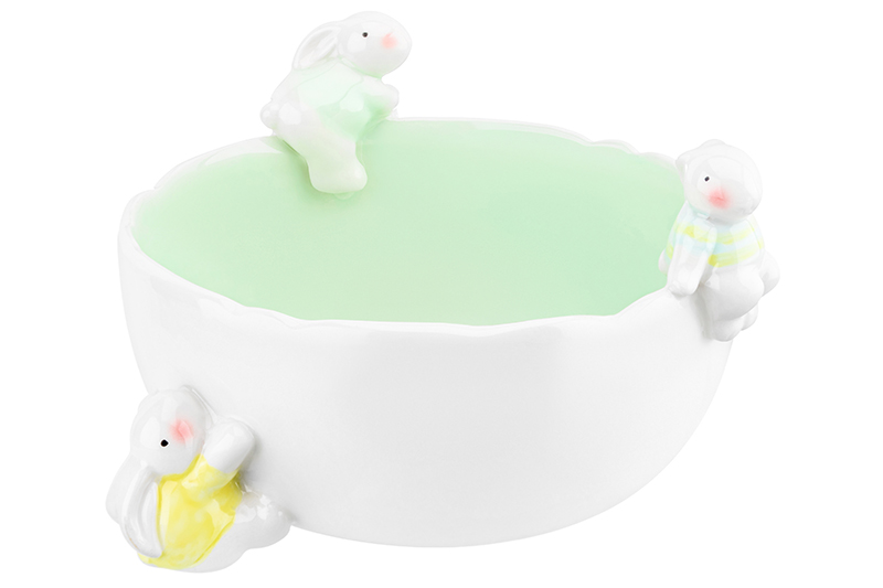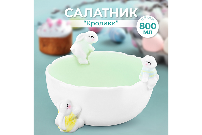 Салатник «Кролики» предназначен для эстетичной подачи блюд и закусок. Размер изделия – 17,5х17,5х10,5 см, объём – 800 мл, размер салатника без фигурок – 16х16х7 см. Выполнен из керамики. Белый салатник с нежно-салатовой внутренней стороной усеян фигурками забавных румяных зайчат в пёстрых одёжках. Фигурки не снимаются! Используйте сервировочное блюдо с фигурками забавных животных для красивой подачи к столу салатов, свежих овощей, фруктов и ягод. Заполните его мясной или сырной нарезкой и украсьте свежей зеленью. Салатник отлично послужит в качестве конфетницы – сложите в него ваши любимые сладости, печенье, орехи или сухофрукты. Блюдце станет оригинальным украшением вашего стола и необычным дополнением кухонного инвентаря! Добавьте вашей кухне атмосферу маленького чуда. Не рекомендуется применять абразивные моющие средства. Нельзя использовать в микроволновой печи и посудомоечной машине. Поставляется в стильной картонной коробке – благодаря ей вам не потребуется дополнительная подарочная упаковка. В коллекции бренда Elan Gallery вы найдёте большой выбор декоративной посуды и сувениров – каждый обязательно подберёт вариант на свой вкус. Изделия станут чудесным подарком для родных, близких и коллег. Наполните пространство вокруг себя уютом и эстетикой! /