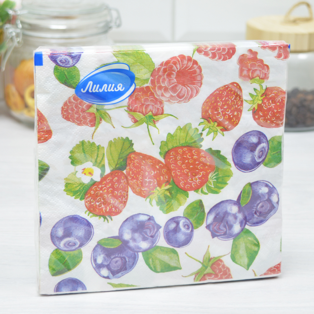 Салфетки 33*33 20 листов 2-слойные "Ягодный фреш"Салфетки отлично подойдут для сервировки стола, украсят праздничный стол.Размер - 33х33 см.Заключаем договора по 44 ФЗ, 223 ФЗ
