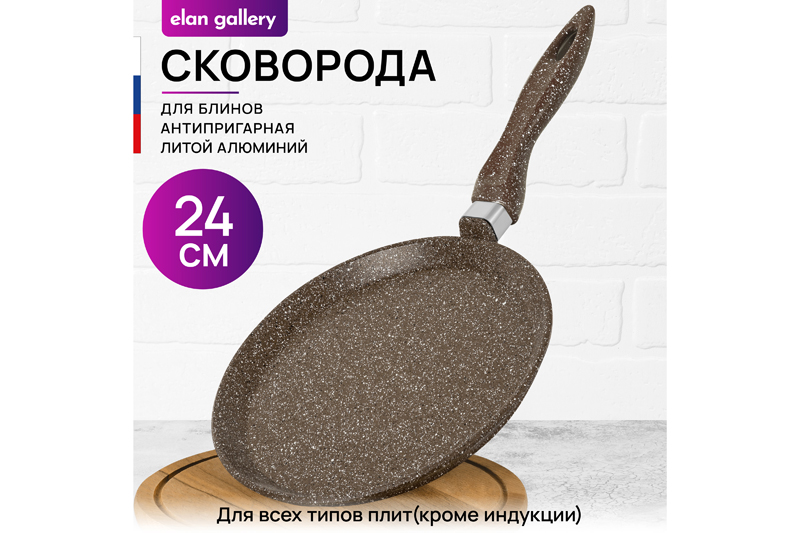 Сковорода блинная Elan Gallery "Гармония вкуса" в оттенке "Коричневый опал" диаметром 24 см равномерно разогревается и распределяет тепло таким образом, чтобы продукты сохраняли все свои полезные и вкусовые свойства. Сковорода изготовлена из литого алюминия и имеет ультрапрочное двухслойное антипригарное покрытие Cookmark. Оно защищает блинчики от пригорания и позволяет переворачивать их лопаткой без особого труда. Выполнена в стильном дизайне. Покрытие устойчиво к царапинам и износу, полностью безопасно для здоровья и не содержит PFOA или других вредных веществ. Готовьте блины идеальной формы на завтрак и радуйте ими своих близких! Эксплуатация: не нагревать без продуктов. Дайте посуде остыть, прежде чем помещать ее в воду. Использовать только деревянные и силиконовые приборы. Не мыть абразивными или щелочными моющими средствами. Использовать в посудомоечной машине только в режиме "Эко" с применением средств, не содержащих щелочи. Подходит для всех типов плит, кроме индукционных. Блинница станет идеальным подарком для женщин и придаст процессу приготовления пищи новый уровень комфорта. Подарите универсальную кухонную утварь вещь маме, подруге, сестре или тёте. Хорошая блинная сковородка – мечта любой хозяйки! В серии "Гармония вкуса" вы найдёте любые кухонные принадлежности и инвентарь для вашего дома. Соберите набор для вашей кухни в едином стиле! /