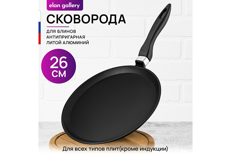 Сковорода блинная Elan Gallery "Гармония вкуса" в оттенке "Чёрный оникс" диаметром 26 см равномерно разогревается и распределяет тепло таким образом, чтобы продукты сохраняли все свои полезные и вкусовые свойства. Сковорода изготовлена из литого алюминия и имеет ультрапрочное двухслойное антипригарное покрытие Cookmark. Оно защищает блинчики от пригорания и позволяет переворачивать их лопаткой без особого труда. Выполнена в стильном дизайне. Покрытие устойчиво к царапинам и износу, полностью безопасно для здоровья и не содержит PFOA или других вредных веществ. Готовьте блины идеальной формы на завтрак и радуйте ими своих близких! Эксплуатация: не нагревать без продуктов. Дайте посуде остыть, прежде чем помещать ее в воду. Использовать только деревянные и силиконовые приборы. Не мыть абразивными или щелочными моющими средствами. Использовать в посудомоечной машине только в режиме "Эко" с применением средств, не содержащих щелочи. Подходит для всех типов плит, кроме индукционных. Блинница станет идеальным подарком для женщин и придаст процессу приготовления пищи новый уровень комфорта. Подарите универсальную кухонную утварь вещь маме, подруге, сестре или тёте. Хорошая блинная сковородка – мечта любой хозяйки! В серии "Гармония вкуса" вы найдёте любые кухонные принадлежности и инвентарь для вашего дома. Соберите набор для вашей кухни в едином стиле! /