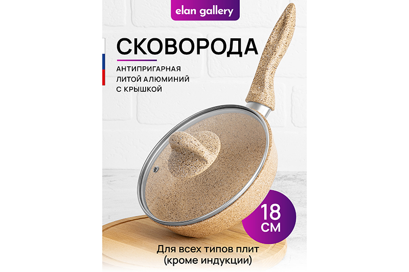 Глубокая сковорода Elan Gallery "Медовый гранит" из серии "Гармония вкуса" диаметром 18 см с крышкой равномерно разогревается и распределяет тепло таким образом, что продукты в ней сохраняют свои полезные свойства, сочность и вкус. Диаметр дна сковороды — 14,5 см. Стильный дизайн, имитирующий гранит, подойдет к любому интерьеру вашей кухни. Сковорода с глубоким дном выполнена из толстостенного литого алюминия и имеет ультрапрочное двухслойное антипригарное покрытие Cookmark. Оно устойчиво к царапинам и износу, полностью безопасно для здоровья и не содержит PFOA или других вредных веществ. Сковороду можно использовать для жарки с минимальным количеством масла для приготовления здоровой пищи, что оценит любой гурман. Готовьте дома любимые стейки, они сохранят свою сочность, нежность и аромат! Сковорода подходит для приготовления блюд из рыбы, мяса, овощей, а также плова. Сковородка станет идеальным помощником для создания завтрака, например: яичницы, омлета, блинов, оладий. Имеет удобную ручку, что обеспечивает надежный захват при подаче еды с плиты на стол. Стеклянная крышка позволит сохранить тепло блюда, защитит от брызг, а также поможет следить за процессом приготовления пищи. Эксплуатация: не нагревать без продуктов. Дайте посуде остыть, прежде чем помещать ее в воду. Использовать только деревянные, силиконовые и пластиковые лопатки без острых краёв. Не мыть абразивными или щелочными моющими средствами. Использовать в посудомоечной машине только в режиме "Эко" с использованием средств, не содержащих щелочи. Подходит для всех типов плит, кроме индукционных. Сковорода станет идеальным подарком для женщин и придаст процессу приготовления пищи новый уровень комфорта. Подарите такую универсальную вещь маме, подруге, сестре или тёте. Хорошая сковорода – мечта любой хозяйки! /