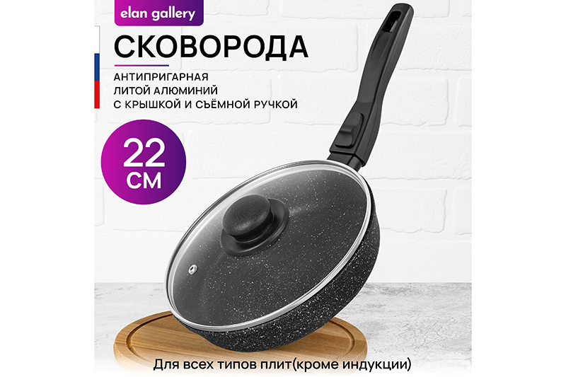 Глубокая сковорода Elan Gallery "Чёрный мрамор" с крышкой и съёмной ручкой из серии "Гармония вкуса" диаметром 22 см равномерно разогревается и распределяет тепло, поэтому продукты в ней сохраняют полезные свойства и сочность. Диаметр дна — 16 см. Стильный дизайн подойдет к любому интерьеру кухни. Подходит для приготовления стейков из рыбы, мяса или блюд из овощей. Сковорода с глубоким дном выполнена из толстостенного литого алюминия и имеет ультрапрочное двухслойное антипригарное покрытие Cookmark. Оно устойчиво к царапинам и износу, безопасно для здоровья и не содержит PFOA или других вредных веществ. Используйте для жарки котлет или картофеля с минимальным количеством масла. Здоровую пищу оценит любой гурман! Готовьте на завтрак оладьи или блюда из яиц: яичницу, омлет. Порадуйте близких большой порцией блинов на Масленицу, ни один блинчик не подгорит. Алюминиевая сковородка с толстым дном имеет удобную ручку, которая обеспечивает надежный захват при подаче еды с плиты на стол. Без крышки и ручки можно использовать в духовом шкафу как форму для запекания при температуре до 250°C. Не использовать съёмную ручку, чтобы достать раскалённую сковороду из духовой печи! Приготовьте румяную курочку в духовке и порадуйте своих близких. Эксплуатация: не нагревать без продуктов. Дайте посуде остыть, прежде чем помещать ее в воду. Использовать только деревянные, силиконовые и пластиковые лопатки без острых краёв. Не мыть абразивными или щелочными моющими средствами. Использовать в ПММ в режиме "Эко" со средством, не содержащим щёлочи. Подходит для стеклокерамических, газовых и электрических плит. Не подходит для индукционных плит. Кухонная утварь станет приятным подарком для женщин на День Рождения, 8 Марта и придаст процессу приготовления пищи комфорта. Подарите универсальную вещь маме, подруге, сестре или бабушке. Хорошая сковорода – мечта любой хозяйки! Сковородка станет незаменимым инвентарем на вашей кухне и наполнит процесс приготовления пищи удовольствием! /