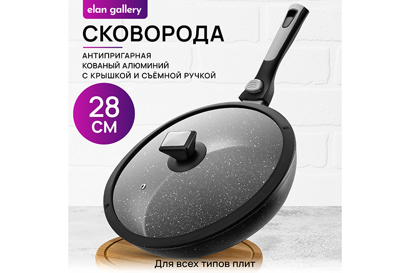 Глубокая сковорода «Чёрный мрамор» из серии Fierra имеет размер 49х29,5х12 см. Высота без крышки – 6 см, диаметр дна – 23 см, диаметр индукционного дна – 20 см. Длина ручки – 20 см. Изготовлена из кованого алюминия, имеет ультрапрочное антипригарное покрытие PFLUON COOКMARK. Оно устойчиво к износу и царапинам, не содержит PFOA и другие вредные вещества. Изделие равномерно нагревается и распределяет тепло, благодаря чему продукты к нём надолго сохраняют сочность и полезные свойства. Ручка из бакелита легко снимается, без неё ёмкость легко поместится в холодильник и в духовку. Покрытие Soft touch обеспечивает дополнительный комфорт при переноске. Стеклянная крышка с тремя пароотводами позволит вам следить за степенью готовности блюд, а большая пластиковая ручка обеспечит удобство снятия. После мытья поверхность изделия моментально высыхает, и вам не придётся вытирать его или долго сушить. Алюминиевая сковорода поможет в приготовлении вкусных блюд дома. Используйте её для жарки котлет, стейков или картофеля с минимальным количеством масла. Приготовьте на завтрак оладьи, яичницу или омлет. Порадуйте близких большим количеством блинов на Масленицу – ни один блинчик не подгорит. Запеките румяную курочку и порадуйте своих близких. Благодаря лёгкому весу удобна для повседневного использования. Эксплуатация: не нагревайте без продуктов. Ставьте посуду строго по центру источника тепла. Не используйте металлические принадлежности, пользуйтесь силиконовыми и деревянными лопатками. Без крышки и ручки можно использовать в духовом шкафу при температуре до 230 градусов. Не используйте съёмную ручку, чтобы достать раскалённую сковородку из духовки. Подходит для всех типов плит, включая индукцию. Не используйте абразивные и щелочные средства. Подходит для использования в посудомоечной машине в режиме «Эко». Красивая сковородка станет отличным подарком любой хозяйке. Пополните свой кухонный инвентарь и привнесите удовольствие в процесс приготовления пищи! /