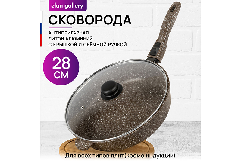 Глубокая сковорода Elan Gallery "Коричневый опал" с крышкой и съёмной ручкой из серии "Гармония вкуса" диаметром 28 см равномерно разогревается и распределяет тепло, поэтому продукты в ней сохраняют полезные свойства и сочность. Диаметр дна — 22 см. Стильный дизайн подойдет к любому интерьеру кухни. Подходит для приготовления стейков из рыбы, мяса или блюд из овощей. Сковорода с глубоким дном выполнена из толстостенного литого алюминия и имеет ультрапрочное двухслойное антипригарное покрытие Cookmark. Оно устойчиво к царапинам и износу, безопасно для здоровья и не содержит PFOA или других вредных веществ. Используйте для жарки котлет или картофеля с минимальным количеством масла. Здоровую пищу оценит любой гурман! Готовьте на завтрак оладьи или блюда из яиц: яичницу, омлет. Порадуйте близких большой порцией блинов на Масленицу, ни один блинчик не подгорит. Алюминиевая сковородка с толстым дном имеет удобную ручку, которая обеспечивает надежный захват при подаче еды с плиты на стол. Без крышки и ручки можно использовать в духовом шкафу как форму для запекания при температуре до 250°C. Не использовать съёмную ручку, чтобы достать раскалённую сковороду из духовой печи! Приготовьте румяную курочку в духовке и порадуйте своих близких. Эксплуатация: не нагревать без продуктов. Дайте посуде остыть, прежде чем помещать ее в воду. Использовать только деревянные, силиконовые и пластиковые лопатки без острых краёв. Не мыть абразивными или щелочными моющими средствами. Использовать в ПММ в режиме "Эко" со средством, не содержащим щёлочи. Подходит для стеклокерамических, газовых и электрических плит. Не подходит для индукционных плит. Кухонная утварь станет приятным подарком для женщин на День Рождения, 8 Марта и придаст процессу приготовления пищи комфорта. Подарите универсальную вещь маме, подруге, сестре или бабушке. Хорошая сковорода – мечта любой хозяйки! Сковородка станет незаменимым инвентарем на вашей кухне и наполнит процесс приготовления пищи удовольствием! /