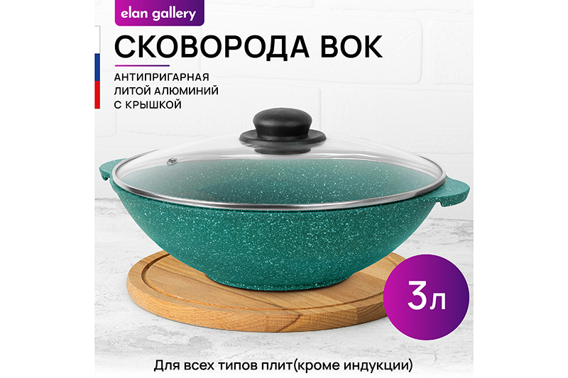 Сковорода ВОК 28 см 3 л ГАРМОНИЯ ВКУСА "Изумруд" С КРЫШКОЙ ф28, 33,5*29,5*13,5 см