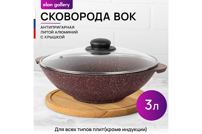 Сковорода-вок "Гармония вкуса" объемом 3 литра с крышкой равномерно разогревается и распределяет тепло таким образом, что продукты в ней остаются сочными и сохраняют все свои полезные и вкусовые свойства. Сковорода выполнена из толстостенного литого алюминия и имеет ультрапрочное двухслойное антипригарное покрытие Cookmark. Покрытие устойчиво к царапинам и износу, полностью безопасно для здоровья и не содержит PFOA или других вредных веществ. Эксплуатация: не нагревать без продуктов. Дайте посуде остыть, прежде чем помещать ее в воду. Использовать только деревянные и силиконовые приборы. Не мыть абразивными или щелочными моющими средствами. Использовать в посудомоечной машине только в режиме "Эко". Подходит для всех типов плит, кроме индукционных. Можно использовать в духовом шкафу без крышки при температуре до 250 градусов. /