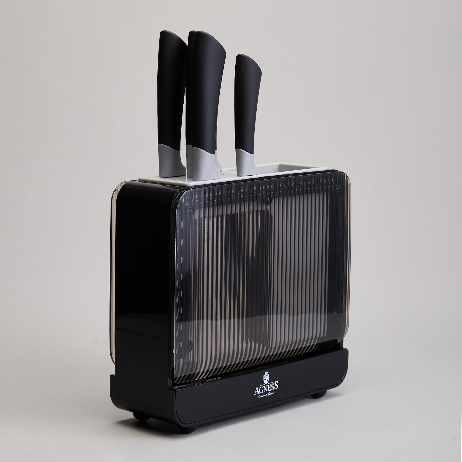 ● Удобная пластиковая подставка для хранения ножей и кухонных принадлежностей.