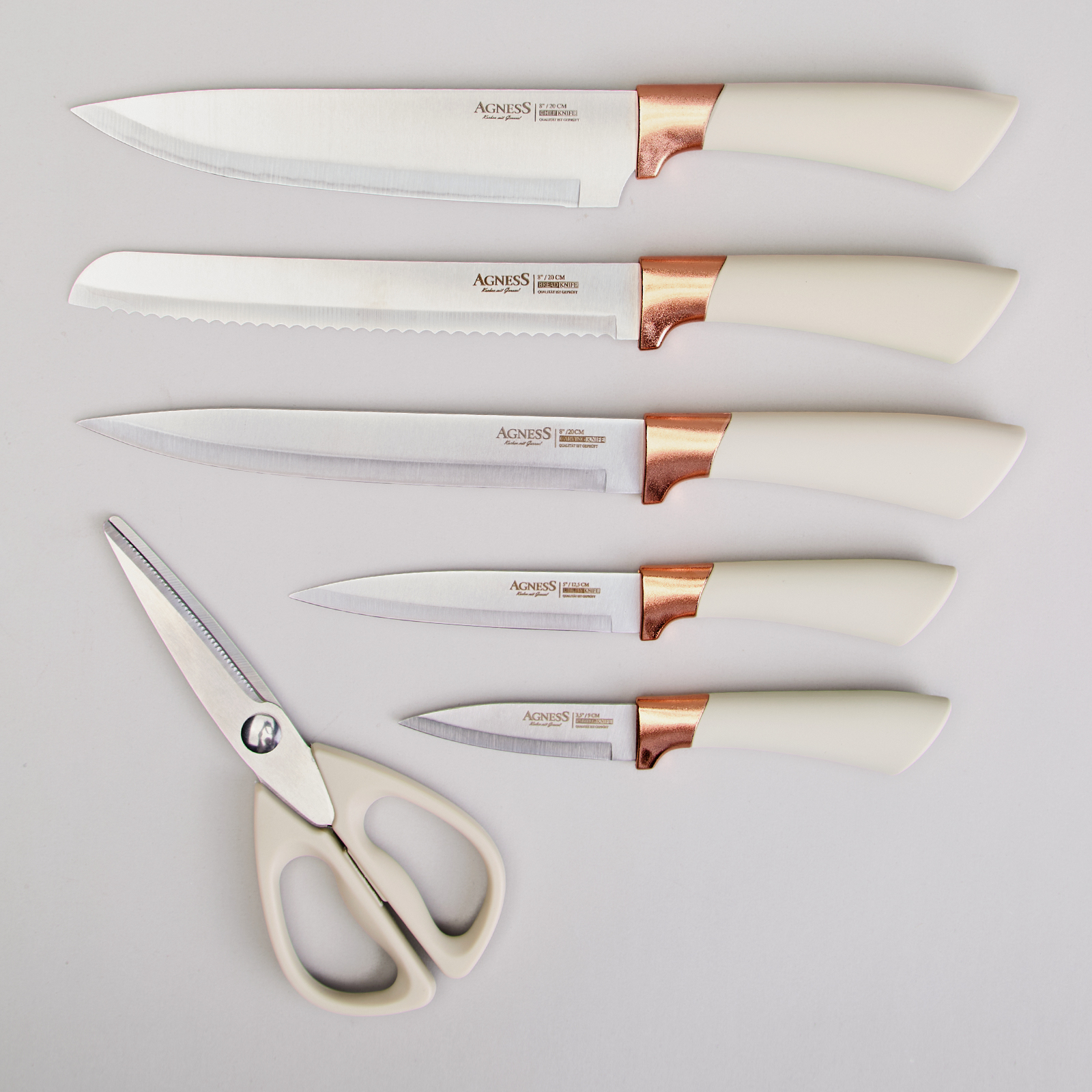 ● Состав набора: Нож поварской 20см, Нож для нарезки 20см, Нож для хлеба 20см, Нож универсальный 12,5см, Нож для чистки овощей и фруктов 9см, Ножницы для птицы.
