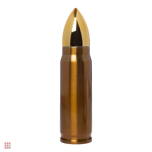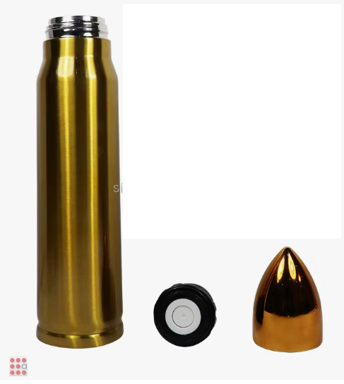 Вакуумный золотой термос с двойными стенками Патрон. Под верхней крышкой расположен герметичный клапан с кнопкой. Объем изделия составляет 350 мл.
