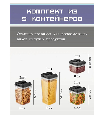 Набор контейнеров для хранения продуктов - это полезное решение для оптимизации пространства в кухонной зоне и в доме. Контейнер для сыпучих продуктов будет удобным органайзером для женщин и мужчин. Наборы емкостей для хранения сыпучих продуктов стильно смотрятся в интерьере любой квартиры, эффективно распределяют место на полках, в ящиках, шкафах. Продукты в прозрачных контейнерах находятся в легкой визуальной доступности. Контейнеры для круп с крышкой плотно закрываются и защищают содержимое от влаги и посторонних запахов. Размещение в ёмкостях позволит надолго сохранить свежесть, аромат и качества еды. Банки для сыпучих продуктов используются для хранения сахара, муки, макаронных изделий, сухофруктов. Контейнеры без запаха, сделаны из прочного пищевого пластика, закрываются герметичной крышкой с клапанным дозатором для нужного расхода.