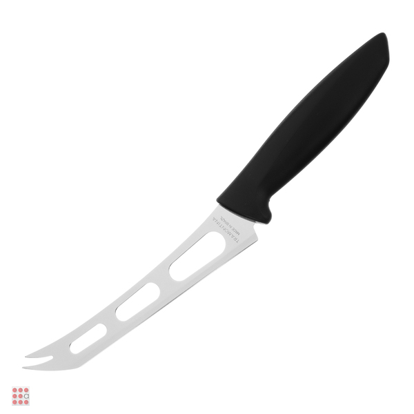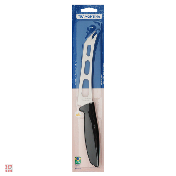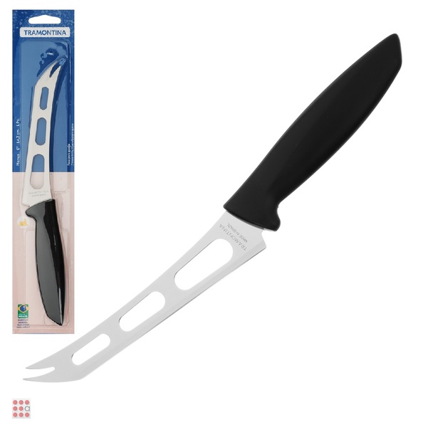 Нож для сыра Tramontina Plenus, имеет лезвие из нержавеющей стали AISI 420 специальной формы с прорезями. Кончик такого ножа раздвоен, образуя «вилочку», которой удобно подхватывать и раскладывать на тарелке тонкие ломтики сыра. У него прямое лезвие, что бы отрезать ломтики одним движением сверху вниз. В лезвии ножа сделаны углубления (воздушные карманы), что бы избежать прилипания сыра к ножу. Пилообразная режущая кромка идеально справляется даже с твёрдыми сортами сыра. Подобные ножи можно использовать также для нарезки томатов, лезвие с микрозубчиками позволит легко разрезать плотную кожицу, не помяв мягкой сердцевины. Рукоять выполнена из качественного полипропилена.