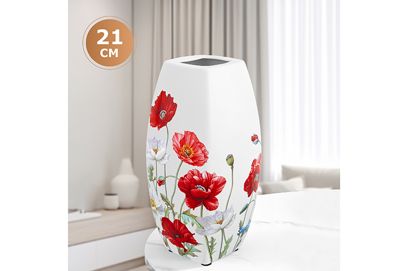 Настольная ваза Elan Gallery "Маки" размером 11х11х21 см и объёмом 1,5 литра прямоугольной формы выполнена из фарфора нового поколения new bone china. New bone china сочетает в себе изящность и высокую прочность. От других видов костяного фарфора материал отличается большей экологичностью в производстве. Серия "Маки" украшена красочным принтом с крупными цветами. Изображение красных и белых маков добавит ярких красок интерьеру. Имеет маленькие антискользящие накладки с обратной стороны дна для устойчивости на гладкой поверхности. Интерьерная вазочка подойдёт для размещения букетов, искусственных цветов или сухоцветов. Она послужит элементом декора вашего дома и поможет украсить его любыми растениями. Как красиво будут смотреться букеты из живых цветов и веточек на кухне и в любой комнате! Поставьте на видное место розы, тюльпаны или вербу для оформления интерьера в квартире. Ваза украсит комнату даже без наполнения и подойдёт для создания декоративных композиций на журнальном столике или полке. Эргономичная форма позволит поставить в неё цветы с длинными стеблями. Не рекомендуется применять абразивные моющие средства. Поставляется в красочной коробке. Станет приятным подарком на любой праздник. Благодаря стильной коробочке вам не понадобится дополнительная подарочная упаковка. Красивая фарфоровая ваза с рисунком станет украшением вашего дома и подчеркнёт красоту любого цветка. Ознакомьтесь с другими товарами для дома от Elan Gallery, здесь вы найдёте всё для создания уюта! /