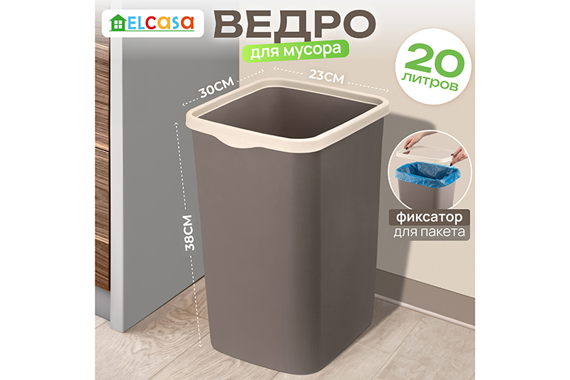 Ведро для мусора с фиксатором ELCASA "Тандем" размером 30х23,2х38,3 см и объёмом 20 литров поможет поддерживать чистоту в вашем доме, офисе или на улице. Мусорное ведро выполнено из полипропилена в шоколадном цвете с фиксатором в оттенке слоновая кость. Этот вид пластика считается наиболее безопасным, так как не содержит бисфенол А и не выделяет вредных веществ. Мусорное ведро прямоугольной формы можно разместить в ванной комнате, туалете или на кухне. Удобный держатель в виде ободка помогает зафиксировать мусорный пакет на ведре и не даёт ему сползать. Поставьте урну из пластика на пол возле раковины, стола или в хозяйственный шкаф. Высокое пластиковое ведёрко можно использовать как офисное – под ненужные бумаги. Большая ёмкость обеспечивает достаточное пространство для хранения мусора любого вида. Можно приспособить на даче как уличную мусорку. Пластиковые мусорные вёдра выполнены в универсальном дизайне и хорошо сочетаются друг с другом. Можно использовать несколько баков из пластика серии "Тандем" для организации раздельной системы сбора мусора. Корзина с фиксатором станет незаменимым помощником для поддержания чистоты как в доме, так и на улице и поможет организовать порядок в любом пространстве. /