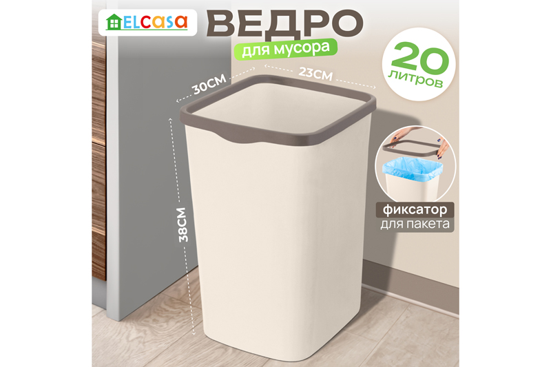 Ведро для мусора с фиксатором ELCASA "Тандем" размером 30х23,2х38,3 см и объёмом 20 литров поможет поддерживать чистоту в вашем доме, офисе или на улице. Мусорное ведро выполнено из полипропилена в расцветке слоновая кость с фиксатором шоколадного цвета. Этот вид пластика считается наиболее безопасным, так как не содержит бисфенол А и не выделяет вредных веществ. Мусорное ведро прямоугольной формы можно разместить в ванной комнате, туалете или на кухне. Удобный держатель в виде ободка помогает зафиксировать мусорный пакет на ведре и не даёт ему сползать. Поставьте урну из пластика на пол возле раковины, стола или в хозяйственный шкаф. Высокое пластиковое ведёрко можно использовать как офисное – под ненужные бумаги. Большая ёмкость обеспечивает достаточное пространство для хранения мусора любого вида. Можно приспособить на даче как уличную мусорку. Пластиковые мусорные вёдра выполнены в универсальном дизайне и хорошо сочетаются друг с другом. Можно использовать несколько баков из пластика серии "Тандем" для организации раздельной системы сбора мусора. Корзина с фиксатором станет незаменимым помощником для поддержания чистоты как в доме, так и на улице и поможет организовать порядок в любом пространстве. /