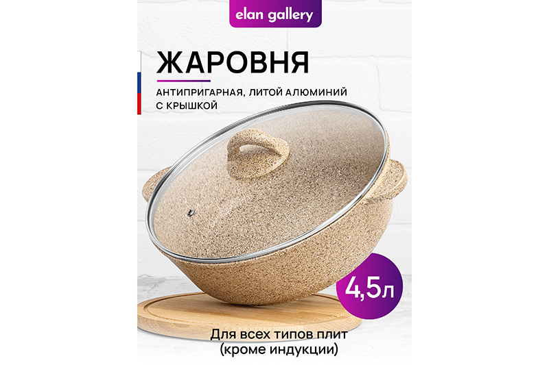 Жаровня «Медовый гранит» из серии «Гармония вкуса» предназначена для приготовления горячих блюд. Размер изделия – 35х29х16,5 см, объём – 4,5 литра. Высота без крышки – 9 см, высота внутренней части – 8,4 см, диаметр дна – 22 см. Сотейник изготовлен из толстостенного алюминия и имеет ультрапрочное двухслойное антипригарное покрытие Cookmark. Оно устойчиво к износу и царапинам, не содержит PFOA и других вредных веществ, что делает его полностью безопасным для здоровья. Толстые стенки и плотно прилегающая крышка из жаропрочного стекла создают при нагреве эффект духовки. Пароотвод обеспечивает равномерную циркуляцию. Жар распределяется по изделию таким образом, что продукты надолго сохраняют свои сочность, аромат и полезные свойства. Красивая алюминиевая жаровня – мечта любой хозяйки. С её помощью вы легко приготовите вкусную пищу дома и на даче. Используйте глубокий сотейник для приготовления мясных, рыбных и овощных блюд. Это универсальная кухонная утварь, подходящая для варки, жарки и тушения. Приготовьте в ней плов, бульон или самые разнообразные угощения из мяса, рыбы и овощей. Правила эксплуатации: не нагревайте без продуктов. Прежде, чем поместить в воду, дайте изделию остыть. Пользуйтесь только деревянными и силиконовыми приборами. Не мойте абразивными или щелочными моющими средствами. Использование в посудомоечной машине допускается только в режиме «Эко» с применением средств, не содержащих щёлочь. Подходит для газовых, электрических и стеклокерамических плит. Не подходит для индукции. Без крышки подходит для запекания в духовом шкафу при температуре до 230 градусов. Такая посуда станет прекрасным подарком маме или бабушке. В серии «Гармония вкуса» вы найдёте сковороды, кастрюли, блинницы, казаны и жаровни. Соберите набор для вашей кухни в едином стиле и дополните свой инвентарь! /