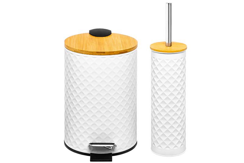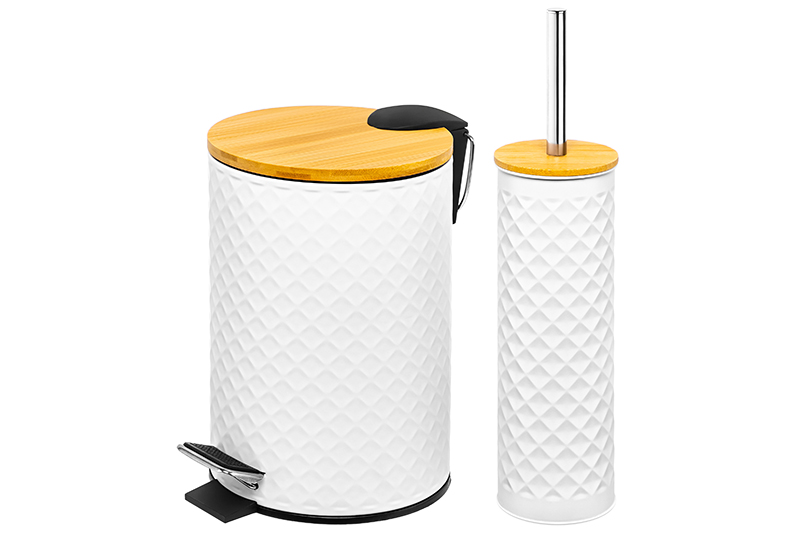 Набор хозяйственных принадлежностей от ELCASA включает в себя ведро с педалью и держатель с ёршиком. Размер ведра – 20х17х25 см, объём – 3 литра. Размер внутреннего ведра – 16,5х16,5х18 см, объём – 2,2 литра. Размер держателя с ёршиком – 9,5х9,5х38 см, длина ручки ёршика – 11 см. Контейнеры и ручка ёршика выполнены из металла, крышки изделий выполнены из бамбука. Внутреннее съёмное ведро у мусорного бака выполнено из пластика. Набор, выполненный в едином стиле, станет универсальным дополнением вашего домашнего инвентаря и поможет вам поддерживать чистоту в доме или офисе. Благодаря элегантному белому цвету изделия впишутся в любой интерьер. Разместите урну в ванной, туалете или на кухне. Поставьте её возле раковины или стола, поместите в хозяйственный шкаф. В офисе она поможет утилизировать бумагу, предметы канцелярии и другие вещи. Удобно открывается благодаря нажимному педальному механизму. Ёршик эффективно очищает всё участки унитаза, достигая даже труднодоступные места. Прочные материалы обеспечивают долговечность и удобство в использовании. Ёрш также подойдёт для очистки других хозяйственных зон ванной комнаты, заменив собой щётку. Не рекомендуется применять абразивные моющие средства. Бамбук нельзя замачивать! В коллекции бренда ЭЛЬКАСА представлено много функциональных товаров для дома, в том числе стильных хозяйственных принадлежностей. Выберите варианты на свой вкус!