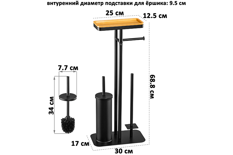 Подставка для туалетной бумаги с ёршиком и полочкой от ELCASA предназначена для организации пространства в вашем доме. Размер изделия – 30х17х68,8 см, размер полочки – 25х12,5 см. Внутренний размер подставки для ёршика – 9,5 см. Размер ёршика – 7,7х34 см, длина ручки – 25 см. Состоит из следующих элементов: пластиковое основание с контейнером для ёршика, ёршик с жёстким густым ворсом и металлической ручкой, один вертикальный держатель для туалетной бумаги и один горизонтальный кронштейн для рулона, пластиковая полочка. Контейнер для ёршика не вынимается из подставки. Полочка оснащена бамбуковым дном и высокими бортиками. Используйте её под мобильный телефон или разнообразные мелочи. Компактный органайзер найдёт место даже в небольшой кабинке туалета. Высокая стойка устойчиво стоит на полу и не требует дополнительных действий при установке – просто поставьте её на пол в санузел без сверления. Все необходимые предметы гигиены будут под рукой. Не рекомендуется применять абразивные моющие средства. Поставляется в дизайнерской картонной коробке – благодаря ей вам не потребуется дополнительная подарочная упаковка. Напольный бумагодержатель станет незаменимым помощником в создании комфорта в вашем доме! В коллекции бренда ЭЛЬКАСА представлено много функциональных товаров для дома, в том числе стильных хозяйственных принадлежностей. Выберите варианты на свой вкус!