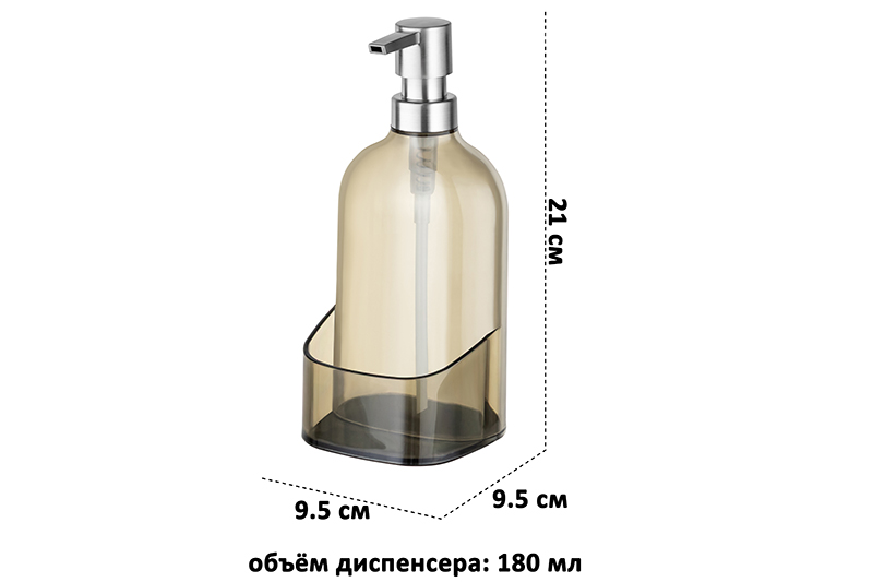 Настольный диспенсер от Elan Gallery подойдёт для хранения жидких моющих и очищающих средств. Размер изделия – 9,5х9,5х21 см, объём – 500 мл. Выполнен из пластика и имеет тёмно-серый оттенок, который лаконично впишется в любой интерьер. Дозатор также выполнен из пластика и предотвратит излишнее проливание. Основание оснащено нескользящей поверхностью. Заполните ёмкость жидким мылом или средством для посуды и расположите на кухонной раковине. Имеется отделение для губки – с ним вы сможете компактно хранить всё необходимое для мытья посуды. В ванной используйте диспенсер под гель для душа или шампунь. Универсальную бутылочку можно приспособить под антисептик. Поставьте её на стол, чтобы дезинфицирующее средство всегда было под рукой. Дополнительное отделение можно приспособить для хранения салфеток, тряпочки для протирки экрана или мелких канцелярских принадлежностей. Не рекомендуется применять абразивные моющие средства. Не подходит для использования в посудомоечной машине. Для очистки изделия воспользуйтесь тёплой водой с добавлением моющего средства. Избегать регулярного прямого контакта с водой (не хранить в душевой кабинке или на полке возле душа). Поставляется в стильной картонной коробке – вам не потребуется дополнительная подарочная упаковка. Декоративный диспенсер от бренда Элан Галерея станет отличным подарком для родных и близких. Это не только практичное, но и эстетичное решение для поддержания чистоты и порядка в вашем доме!