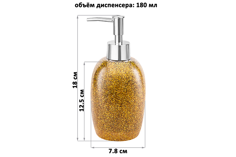 Настольный диспенсер от Elan Gallery подойдёт для хранения жидких моющих и очищающих средств. Размер изделия – 7,8х7,8х18 см, объём – 270 мл. Высота без дозатора – 12,5 см. Выполнен из полирезина – современного материала, отличающегося лёгкостью и устойчивостью к влаге. Он не выделяет вредных веществ и не впитывает посторонние запахи. Благодаря высокой прочности изделие надолго сохранит привлекательный внешний вид. Поверхность изделия заполнена переливающимися серебряными блёстками. Ввиду особенностей изготовления корпуса поверхность остаётся гладкой, а блёстки не осыпаются. Дозатор серебряного цвета выполнен из пластика. Он герметичен и надёжно предотвращает проливание. Благодаря красивому дизайну и необычной форме баночка найдёт место в любой части вашей квартиры. Заполните ёмкость жидким мылом или средством для посуды и расположите на кухонной раковине. В ванной используйте флакон под гель для душа или шампунь. Универсальную бутылочку можно приспособить под антисептик. Поставьте её на рабочий стол в своей комнате или кабинете, чтобы дезинфицирующее средство было под рукой. Не рекомендуется применять абразивные моющие средства. Не подходит для использования в посудомоечной машине. Для очистки изделия воспользуйтесь тёплой водой с добавлением моющего средства. Поставляется в дизайнерской картонной коробке – вам не потребуется дополнительная подарочная упаковка. Декоративный диспенсер от бренда Элан Галерея станет отличным подарком для родных и близких. Это не только практичный, но и эстетичный аксессуар для поддержания гигиены, подходящий под любой интерьер!