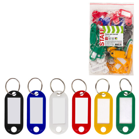 Бирки для ключей КОМПЛЕКТ 100 ШТ., длина 50 мм, инфо-окно 30х15 мм, АССОРТИ, STAFF, 237493, 90