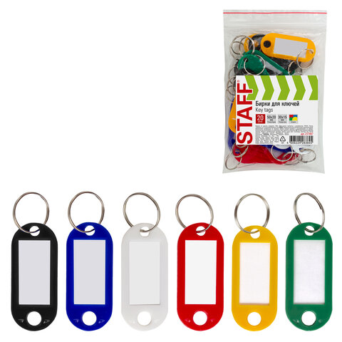 Бирки для ключей КОМПЛЕКТ брелоков 20 шт., длина 50 мм, инфо-окно 30х15 мм, АССОРТИ, STAFF, 237487