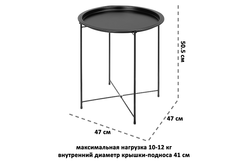 Столик журнальный ELCASA "Чёрный" со съёмной крышкой-подносом (размер столика 47х47х50,5 см, размер крышки 47х47х2,3 см, внутренний диаметр крышки-подноса 41 см) отлично впишется в любой современный интерьер, от скандинавского до лофт. Круглый стол чёрного цвета изготовлен из металла, выдерживает нагрузку до 12 кг. Крышка снимается и может использоваться отдельно как поднос для подачи завтрака в кровать. Бортики по краям придают ему элегантности и позволяют устойчиво разместить посуду. Наслаждайтесь ароматным кофе и крепким чаем прямо в постели! Сервировочный столик подойдет так же для проведения уютных вечеров с бокалом вина или кружкой чая. Идеальное сочетание элегантности и функциональности сделает небольшой стол незаменимым элементом декора вашей комнаты, кухни, спальни и даже балкона. Компактный столик легко поднять, что позволяет перемещать его из комнаты в коридор или прихожую. Можно использовать как прикроватную тумбочку или поставить в рабочий кабинет. Столик-трансформер, выполненный в стильном дизайне, позволит держать все необходимые мелочи под рукой. Благодаря прикроватной высоте стола на нем удобно размещать книги, часы, мобильный телефон и другие принадлежности. В ванной женщины могут хранить на маленьком столике косметику и хозяйственный инвентарь. В комнате удобно использовать его как журнальный или косметический столик. Можно украсить стол вазой с цветами, что добавит уюта в интерьер вашего дома или офиса. Используйте многофункциональный столик для сервировки сэндвичей на террасе загородного дома или пикнике. Не рекомендуется применять абразивные моющие средства. Подойдет в подарок как мужчинам, так и женщинам. Универсальный столик поможет добавить уюта в офисный или домашний интерьер и будет незаменим для размещения журналов, книг, чашек с чаем и цветов!