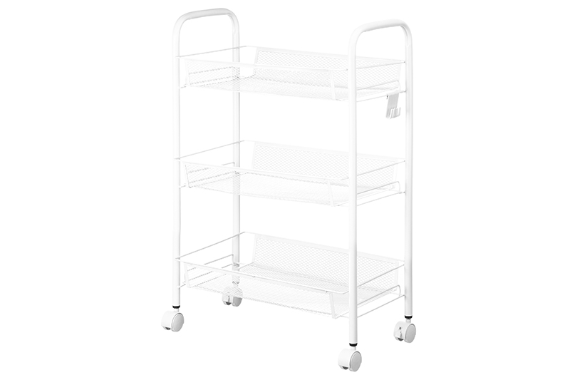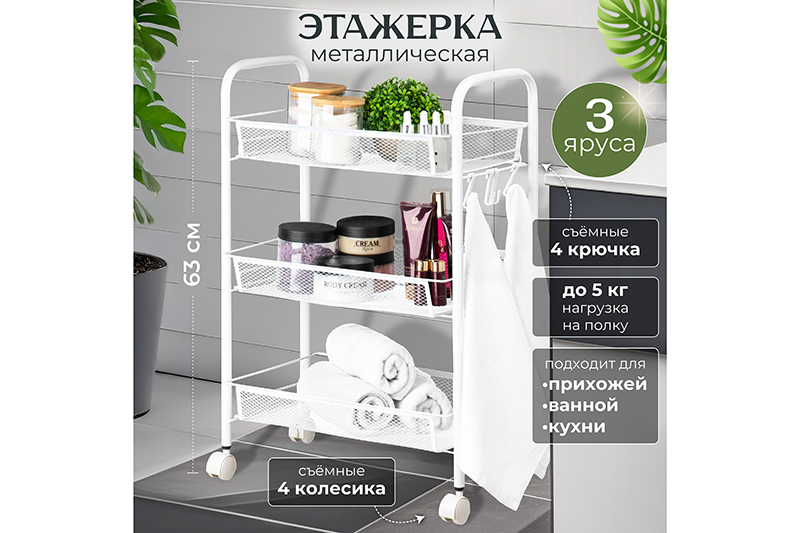 Трёхъярусная этажерка ELCASA "Белая" 44,5х25,5х63,5 см (без колес — 44,5х25,5х58,5 см) поможет создать порядок. Выполнена из металла, имеет 4 колёсика. Размер 1 полки — 41х25,5х5,5 см, расстояние между корзинками — 20 см. Максимальная нагрузка на 1 полочку — 5 кг. Высота от пола до нижней корзины без колес — 5,5 см, с колесами — 9,5 см. 2 колесика имеют фиксаторы, система тормоза позволяет закрепить этажерку на месте. Маленький открытый шкаф имеет 4 крючка для подвешивания аксессуаров, инструментов и хозяйственного инвентаря. Можно повесить щётки, мочалку, пакет или косметичку. Крючки съёмные, можно убрать. Стеллаж удобно перемещать за ручки, как тележку. Здесь достаточно места для посуды, в корзины можно сложить фрукты. Открытый шкафчик можно поставить боком в угол, как угловой, в гардеробную или кладовку. Ящики в виде металлической сетки удобны для флаконов и баночек, принадлежностей для маникюра и других мелочей. Пригодится в салоне красоты: в кабинете парикмахера и косметолога. В парикмахерской компактный уголок придётся очень кстати! Мобильную этажерку можно использовать для хранения вещей везде: на кухне для овощей и фруктов, в ванной для косметики и бытовых средств, в прихожей для аксессуаров в роли передвижной обувницы. Тапочки и обувь будут на месте! Поставьте рядом со столом или раковиной в туалете, чтобы организовать место для хранения предметов гигиены. В спальне стойка подойдёт в роли прикроватной тумбочки или туалетного столика с полками. В комнате она послужит удобным органайзером для книг, игрушек и декора. Книжный стеллаж впишется в любой интерьер детской благодаря универсальному дизайну и позволит хранить книжечки и журналы эстетично. На балконе станет удобной тумбой для рассады: расположите в секциях цветы и другие растения. Напольная этажерка станет полезным подарком для тех, кто ценит практичную мебель для квартиры, дачи и даже офиса. В коллекции бренда представлены стильные товары для дома, выберите варианты на свой вкус.
