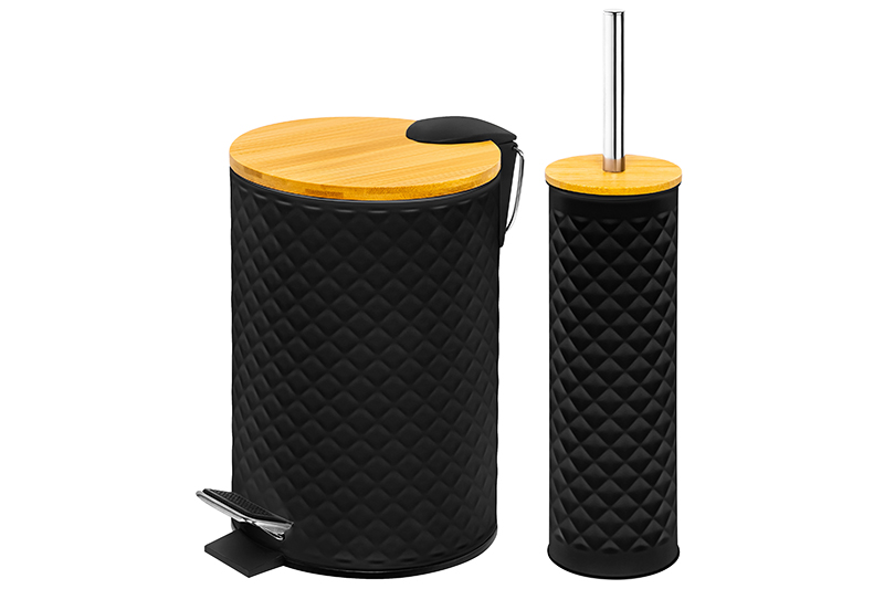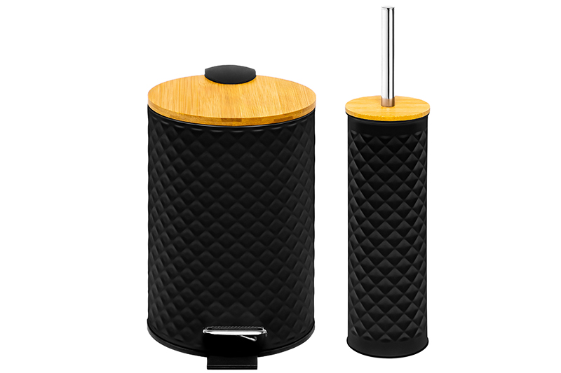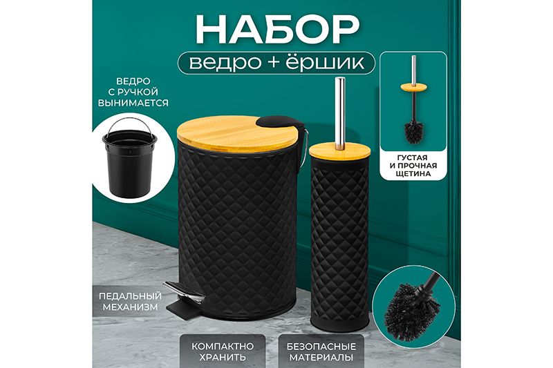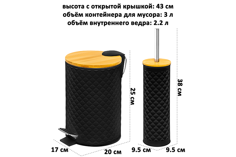 Набор хозяйственных принадлежностей от ELCASA включает в себя ведро с педалью и держатель с ёршиком. Размер ведра – 20х17х25 см, объём – 3 литра. Размер внутреннего ведра – 16,5х16,5х18 см, объём – 2,2 литра. Размер держателя с ёршиком – 9,5х9,5х38 см, длина ручки ёршика – 11 см. Внешние контейнеры и ручка ёршика выполнены из металла, крышки изделий выполнены из бамбука. Внутреннее съёмное ведро у мусорного бака выполнено из пластика. Набор, выполненный в едином стиле, станет универсальным дополнением вашего домашнего инвентаря и поможет вам поддерживать чистоту в доме или офисе. Благодаря элегантному чёрному цвету изделия впишутся в любой интерьер. Разместите урну в ванной, туалете или на кухне. Поставьте её возле раковины или стола, поместите в хозяйственный шкаф. В офисе она поможет утилизировать бумагу, предметы канцелярии и другие вещи. Удобно открывается благодаря нажимному педальному механизму. Ёршик эффективно очищает всё участки унитаза, достигая даже труднодоступные места. Прочные материалы обеспечивают долговечность и удобство в использовании. Ёрш также подойдёт для очистки других хозяйственных зон ванной комнаты, заменив собой щётку. Не рекомендуется применять абразивные моющие средства. Бамбук нельзя замачивать! В коллекции бренда ЭЛЬКАСА представлено много функциональных товаров для дома, в том числе стильных хозяйственных принадлежностей. Выберите варианты на свой вкус!