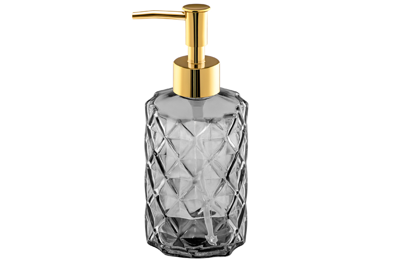 Стеклянный диспенсер подойдёт для хранения жидких моющих и очищающих средств. Размер изделия – 7,3х7,3х18 см, объём – 330 мл. Полупрозрачная поверхность диспенсера имеет графитовый цвет и украшена рельефным геометрическим узором. Дозатор золотого цвета изготовлен из пластика. Стильная баночка найдёт своё место на кухне, в ванной и даже в прихожей. Благодаря изящному дизайну она дополнит интерьер любой квартиры. Компактные размеры позволят разместить флакон на полке, столе или тумбочке. Залейте в ёмкость жидкое мыло, средство для посуды или антисептик. Можете наполнить диспенсер гелем для душа или шампунем и поставить в ванной. Не рекомендуется применять абразивные моющие средства. Поставляется в картонной упаковке. Настольный диспенсер – это не только практичное, но и стильное решение для организации чистоты и порядка в вашем доме.