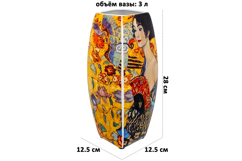 Настольная ваза Elan Gallery "Дама с веером" размером 12,5х12,5х28 см и объёмом 3 литра прямоугольной формы выполнена из фарфора нового поколения new bone china. Благодаря современным технологиям этот вид не уступает традиционному костяному фарфору в прочности, но гораздо экологичнее в производстве. Имеет маленькие антискользящие накладки с обратной стороны дна для устойчивости на гладкой поверхности. В коллекции бренда Elan Gallery можно найти много красивой посуды и предметов декора с изображениями по мотивам шедевров мировой живописи! Высокая вазочка украшена репродукцией картины известного художника Густава Климта. Яркий и узнаваемый сюжет с девушкой на фарфоровом изделии удачно впишется в любой стиль интерьера, добавляя красоты и романтики. Интерьерная ваза подойдёт для размещения букетов, искусственных цветов или сухоцветов. Она послужит элементом декора вашего дома и поможет украсить его любыми растениями. Как красиво будут смотреться букеты из живых цветов и веточек на кухне и в любой комнате! Поставьте на видное место розы, тюльпаны или вербу для оформления интерьера в квартире. Интерьерная ваза украсит комнату даже без наполнения и подойдёт для создания декоративных композиций на журнальном столике или полке. Эргономичная форма позволит поставить в неё цветы с длинными стеблями. Не рекомендуется применять абразивные моющие средства. Поставляется в прочной красочной коробке. Станет шикарным подарком вашим близким на любой праздник. Благодаря стильной коробочке вам не понадобится дополнительная подарочная упаковка. Сделайте сюрприз ценителям искусства! Красивая фарфоровая ваза с рисунком станет украшением вашего дома и подчеркнёт красоту любого цветка. Ознакомьтесь с другими товарами для дома от Elan Gallery, здесь вы найдёте всё для создания домашнего уюта!